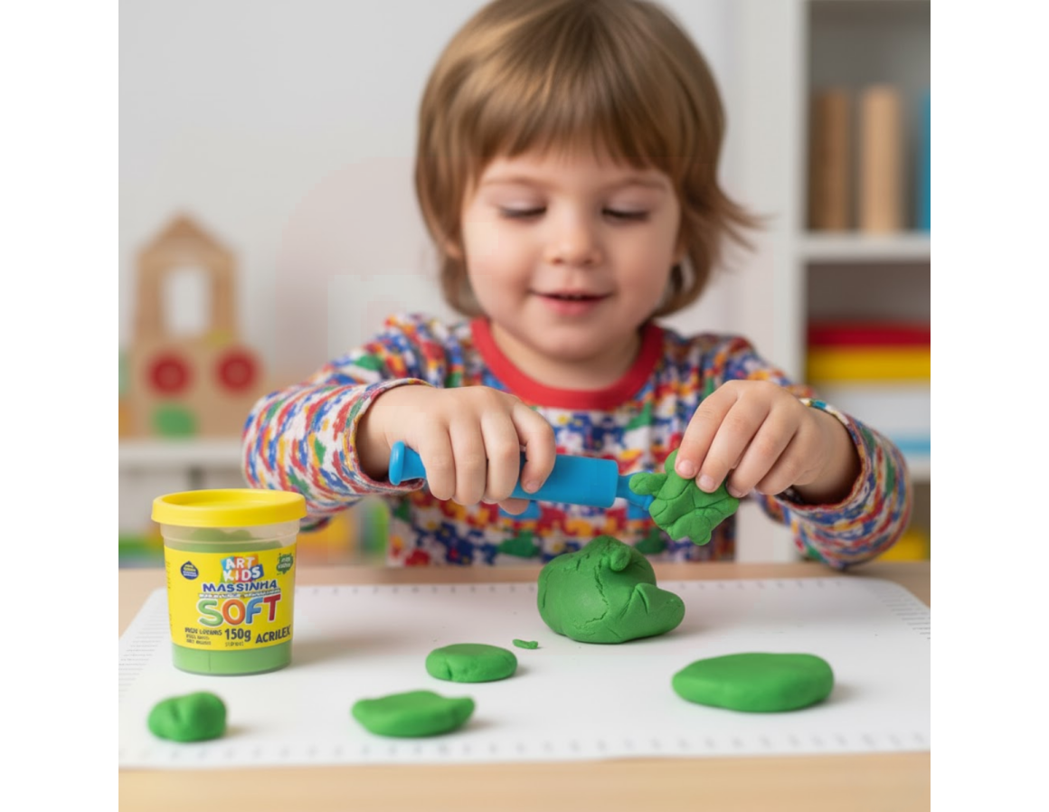 A Massa de Modelar Soft 150g Verde - Acrilex é perfeita para soltar a criatividade de crianças e adultos! Sua textura macia e fácil de moldar proporciona uma experiência sensorial agradável e divertida. Desenvolvida com alta qualidade Acrilex, não gruda nas mãos, não resseca facilmente e oferece cores vivas e intensas, ideais para atividades escolares, artesanais e recreativas. Estimula a coordenação motora, a criatividade e o desenvolvimento cognitivo, tornando o aprendizado ainda mais lúdico.